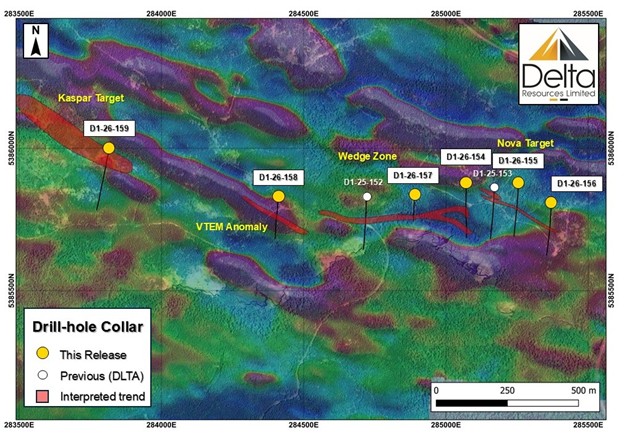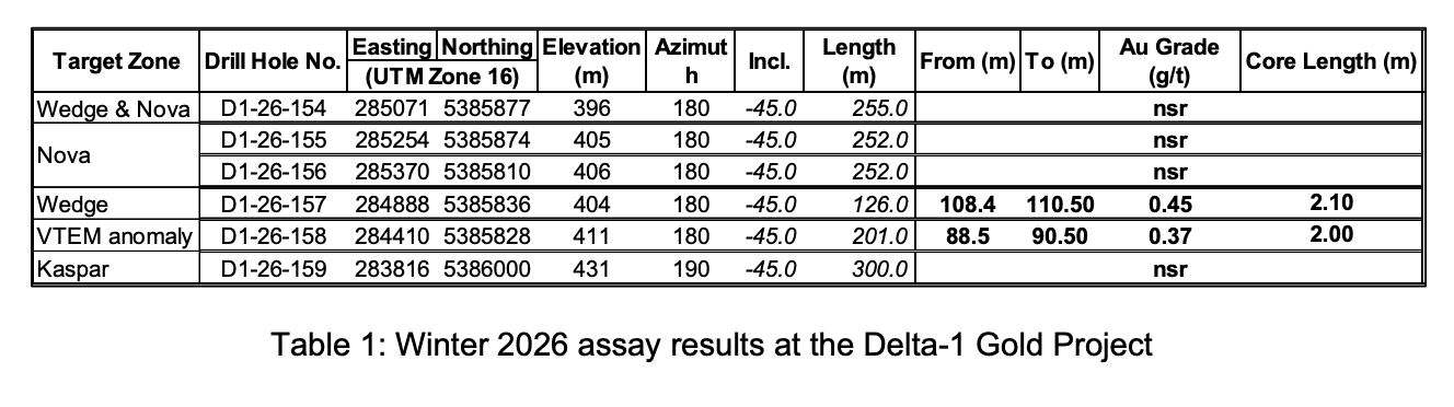 “This phase of drilling demonstrated the presence of anomalous gold within favorable host rocks confirming our geological model and providing critical data to refine targets and improve future drill effectiveness. Encouraging indicators of scale and continuity support clear pathways for continued value creation as exploration advances,” commented Dan Boudreau, VP Exploration of Delta.