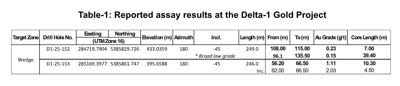 - Confirmation of gold mineralization at the Wedge Zone in hole D1-25-152.
