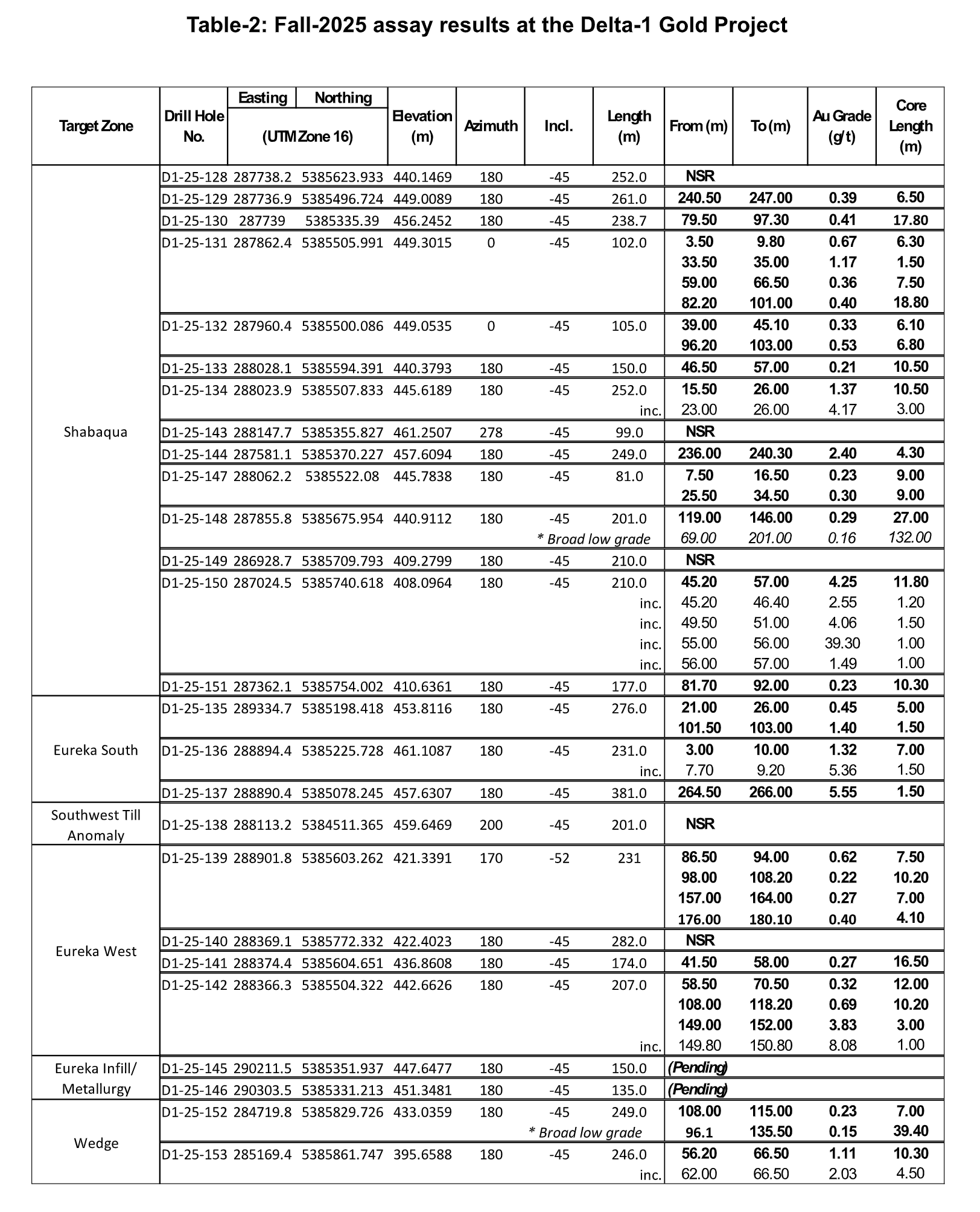 - New gold intercept in hole D1-25-153 at the Nova target (Wedge area), located approximately 450 metres east of the Wedge Zone and 4 km west of the Eureka Gold Deposit, returning 1.11 g/t Au over 10.3 metres.